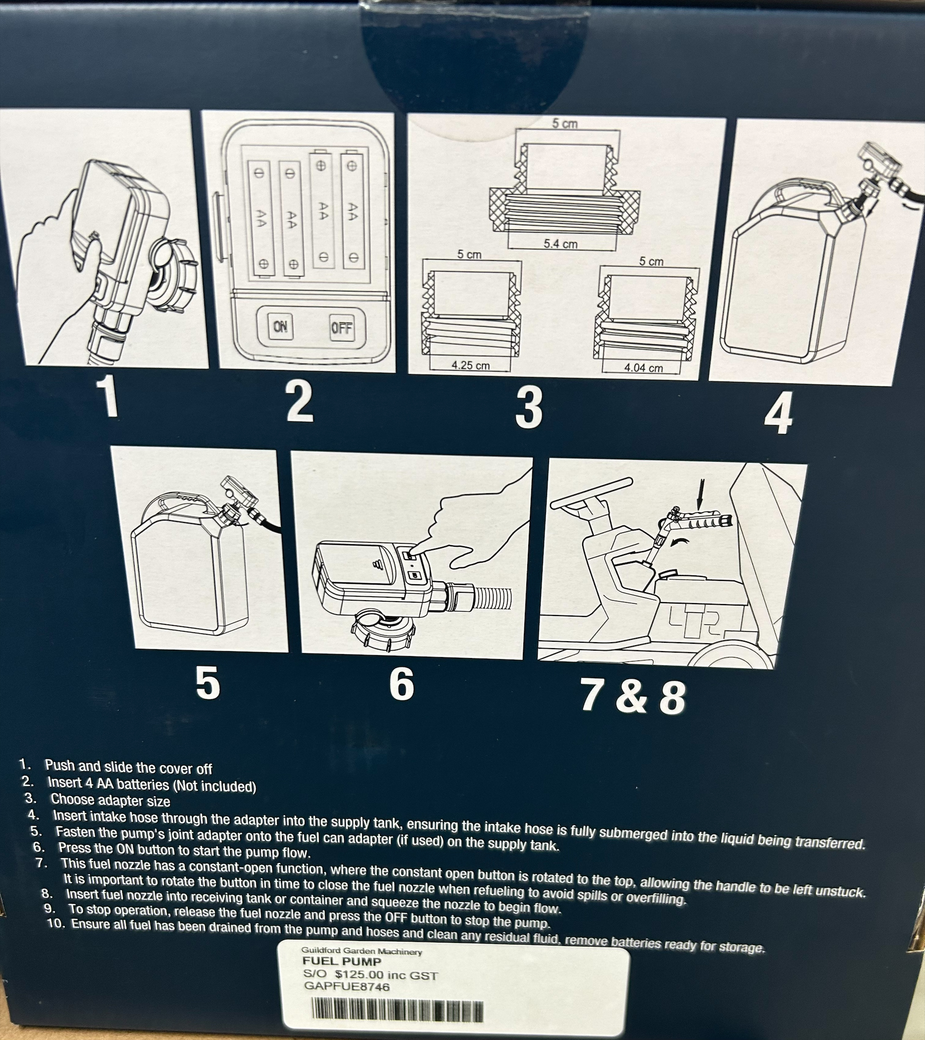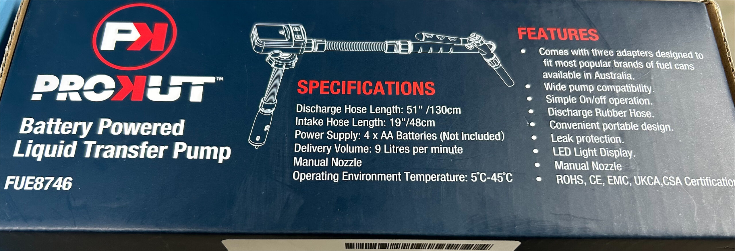 Transfers 9.084 litres (2.4 gallons) per minute, the pump is powered by 4 x AA batteries, has a manually operated nozzle and the rubber discharge hose length is 130 cm (51.18″) long.